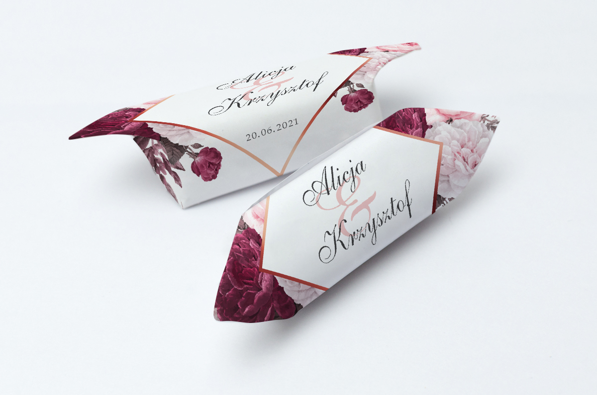 Krówki ślubne 1 kg - Podziękowania dla gości - Geometryczne Kwiaty - Amarantowy bukiet