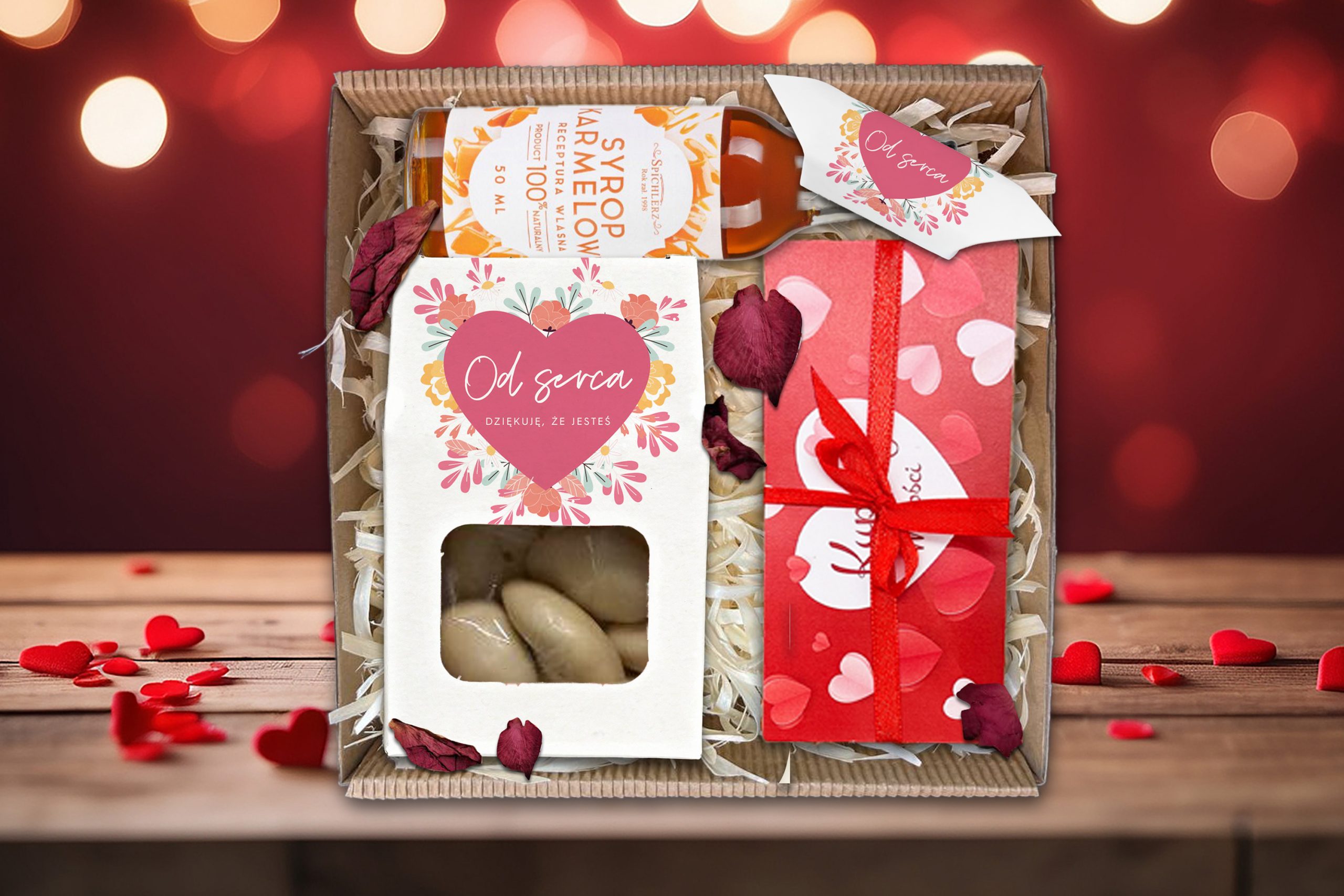 Nasz mały zestaw walentynkowy to przemyślana kompozycja słodkości i kreatywnego dodatku, który osłodzi Wasze wspólne chwile. Produkty zostały ułożone na naturalnej wełnie drzewnej, która zapewnia estetyczną oprawę i podkreśla rzemieślniczy charakter prezentu.