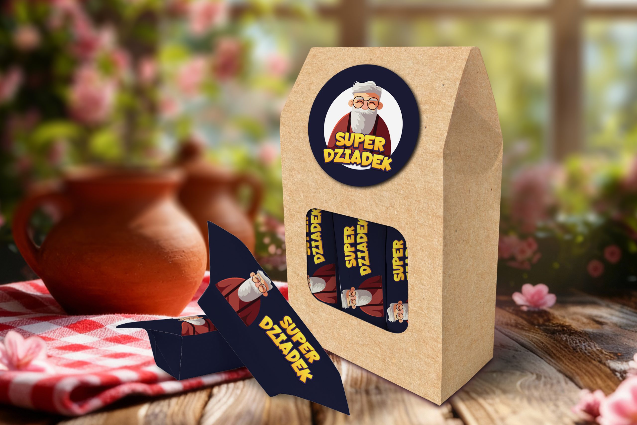 Pudełeczko ozdobione naklejką „Super Dziadek” nadaje upominkowi osobistego charakteru i elegancji. To gotowy do wręczenia drobiazg, który idealnie sprawdzi się jako słodki wyraz wdzięczności i miłości.