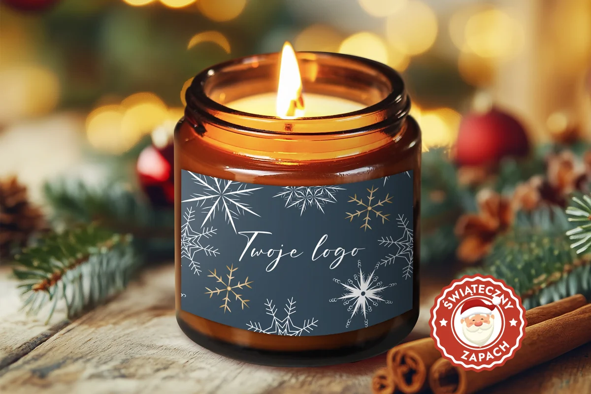 Każda świeca zamknięta jest w stylowym, 60 ml słoiczku w kolorze piernika, ozdobionym świąteczną naklejką. Naklejka może zostać spersonalizowana logotypem Twojej firmy.