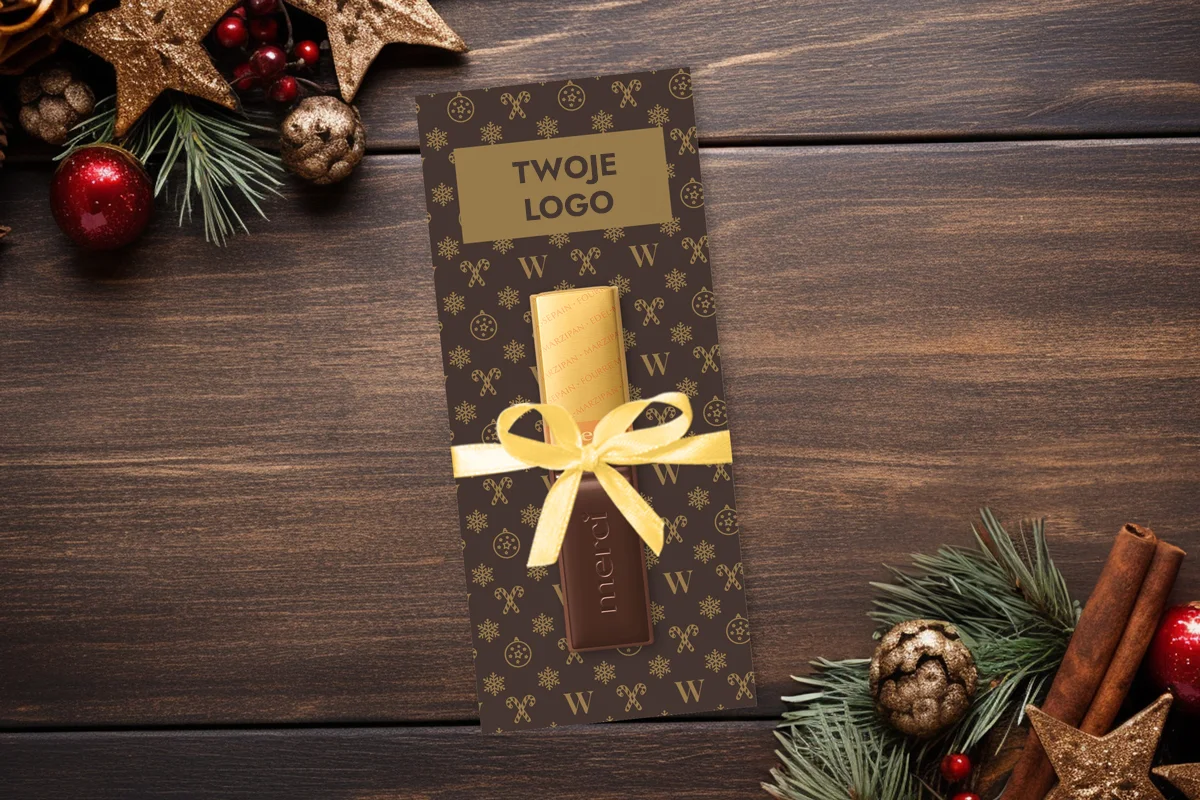 Personalizowane czekoladki Merci z etykietą z Twoim logo to elegancki prezent na Święta i wyjątkowy upominek świąteczny dla klientów, partnerów biznesowych i pracowników.