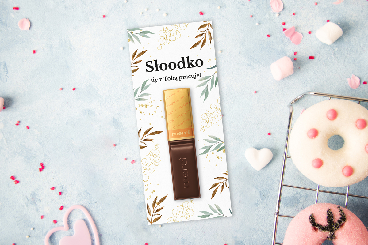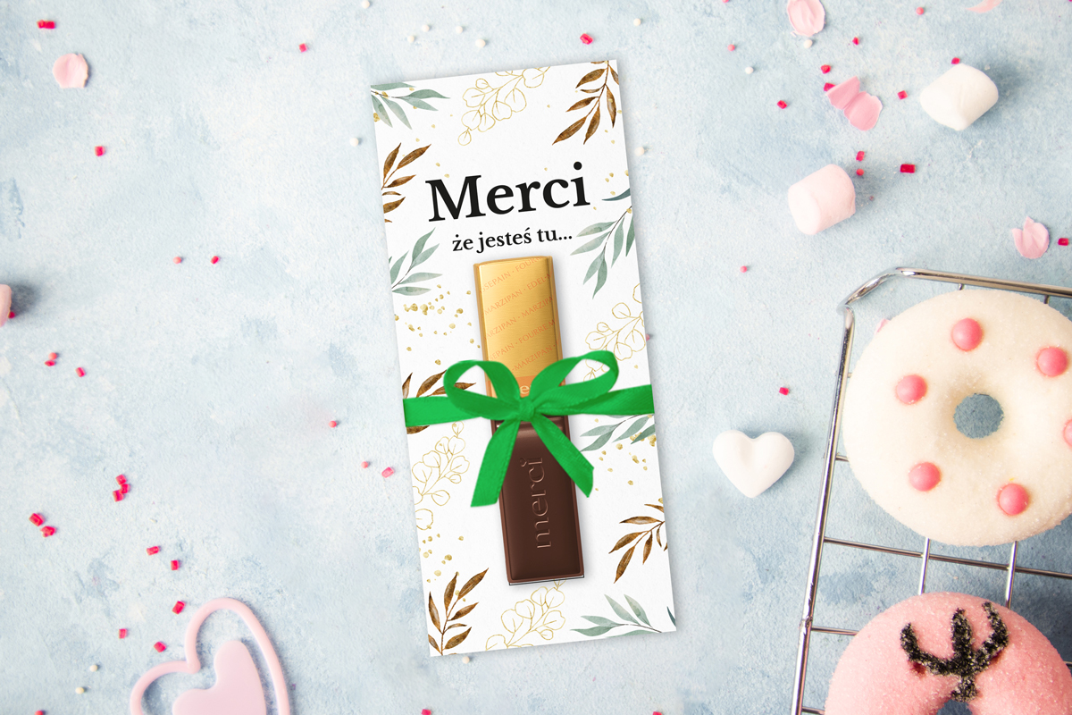 • Możliwość wyboru wersji bez czekoladki lub z czekoladką Merci – 12,5