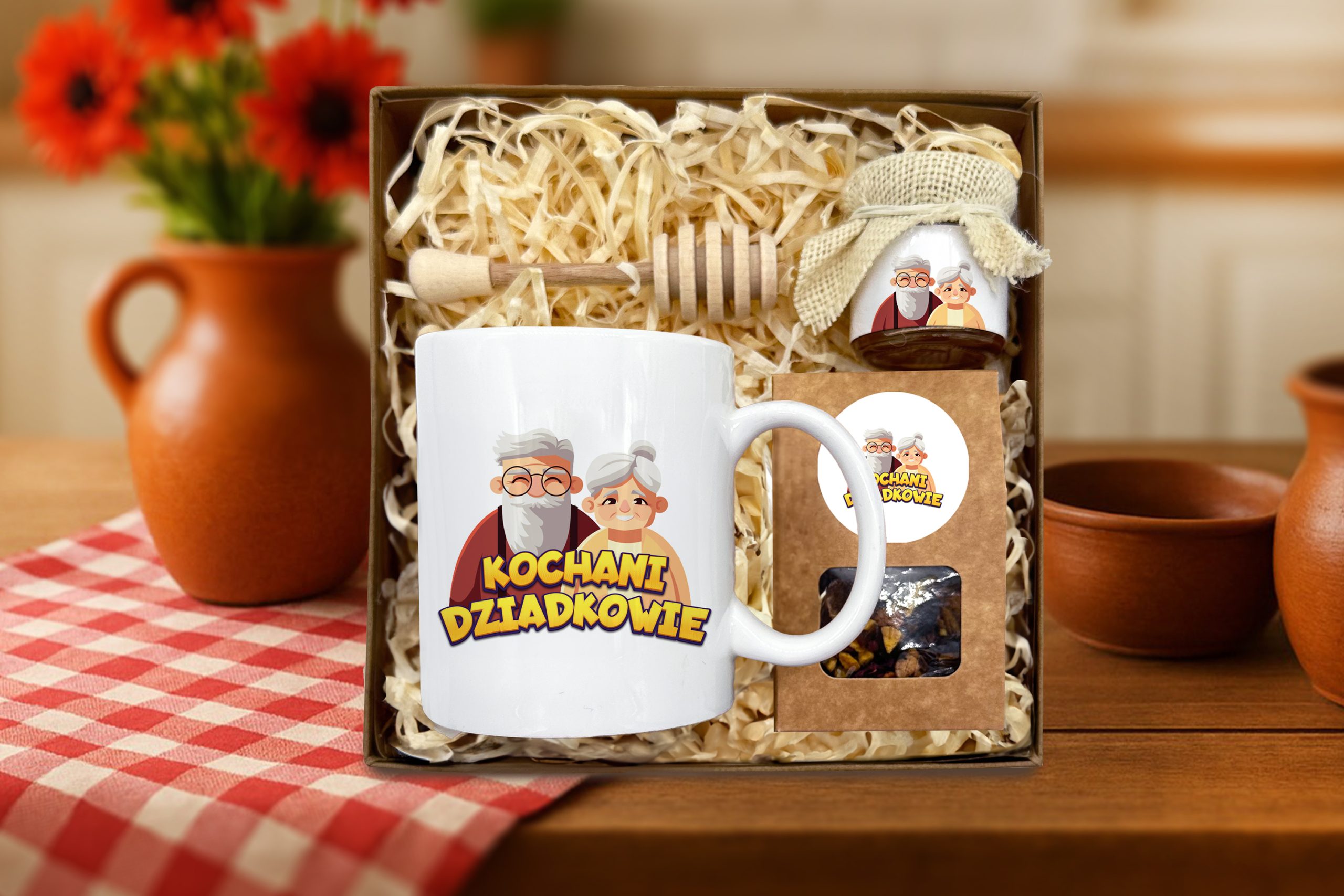 Zestaw Prezentowy - dla Babci i Dziadka - Kubek Dziadkowie, miód, czerpak, herbata