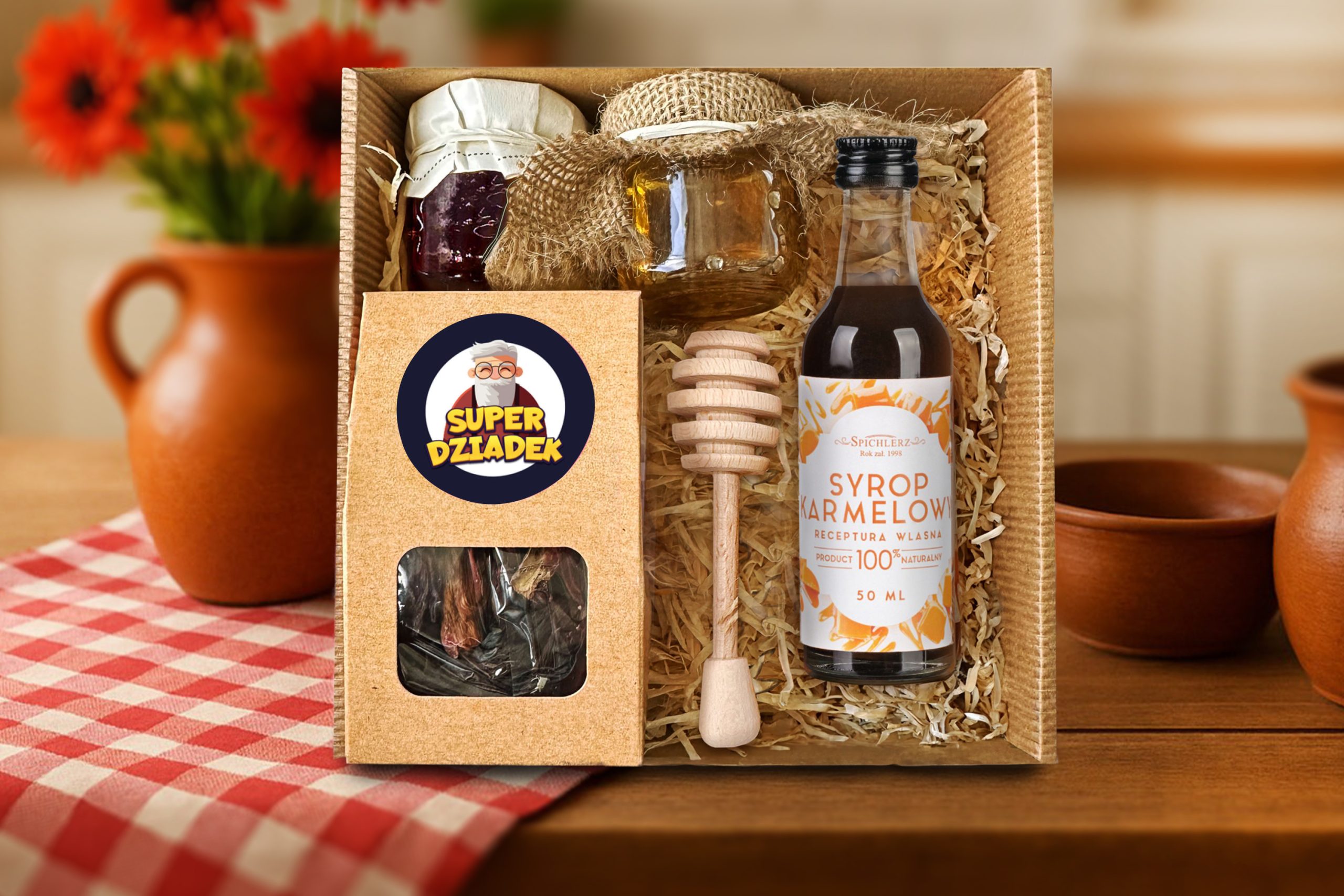 Zestaw Prezentowy 7 - Prezent na Dzień Dziadka - Herbata, miód, konfitura, czerpak, syrop